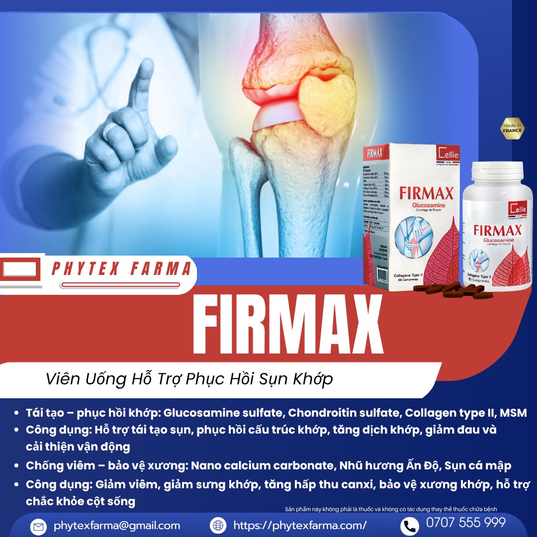 Bổ sung Firmax – sản phẩm hỗ trợ xương khớp nhập khẩu từ Pháp, chứa Glucosamine, Chondroitin, Collagen type II, MSM, sụn cá mập và chiết xuất Nhũ hương, giúp: