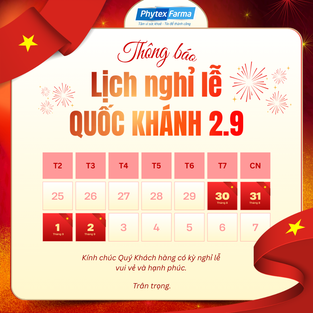 Nhân dịp kỷ niệm 80 năm Quốc khánh (2/9/1945 – 2/9/2025), Phytex Farma trân trọng thông báo đến Quý khách hàng và Quý đối tác lịch nghỉ lễ Quốc khánh năm 2025.